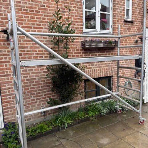 Rullestillads i aluminium med hjul. Stilladset består af lodrette rammer, tværstivere og platform i midten. Egnede anvendelser kan være malerarbejde, facade- og vedligeholdelsesopgaver, hvor der er behov for mobil adgang i højde. Konstruktionen er udført i letvægts aluminium, som gør det nemt at flytte stilladset rundt på jævne underlag. Hjulene kan låses for stabilitet under brug. Velegnet til både mindre bygge- og renoveringsopgaver udendørs og indendørs, hvor arbejdshøjde og mobilitet er vigtig.