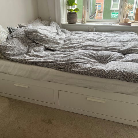 IKEA fyresdal i metal i sort. Rammen har ryglæn og armlæn, så den kan bruges både som seng og som sofa. Egnet til brug med madras i standard enkeltsengsstørrelse samt kan trækkes ud som dobbeltseng. Enkel, åben konstruktion med lamelbund i metal, der giver ventilation under madrassen. Passer til soveværelse, gæsteværelse eller stue som ekstra soveplads. 2 madrasser medfølger