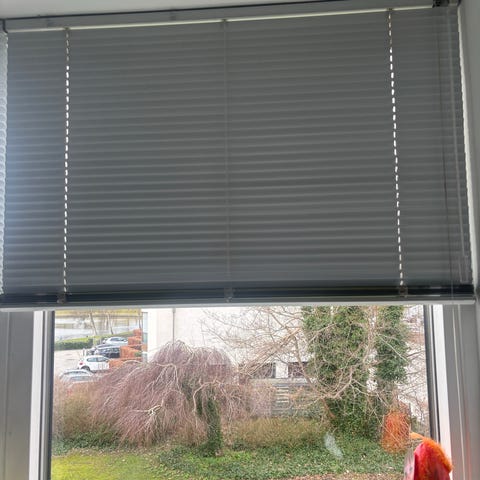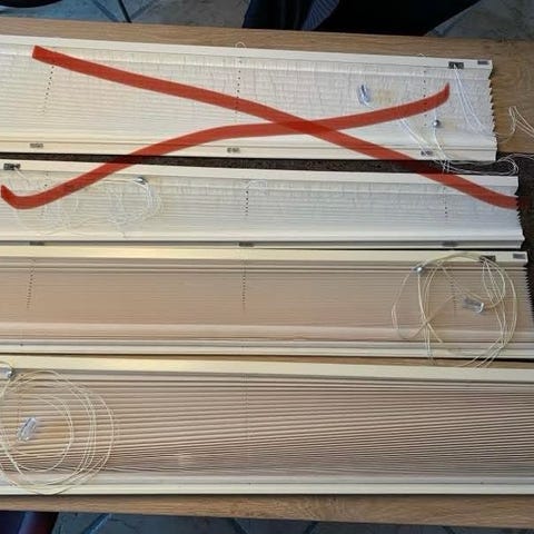 En med snoretræk til højre og en med snoretræk til venstre. Den enes ‘førerstang’ et brækket, men persiennen fuld funktionsdygtig.