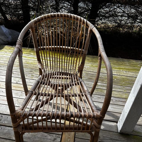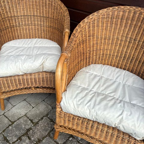 Flettede kurvestole spisebordsstole i rattan i lys naturfarve. Stolene har høj ryg med flettet mønster og armlæn samt rund, flettet siddeflade. Velegnet som spisebordsstole eller ekstra siddepladser i stue, udestue eller køkkenalrum.