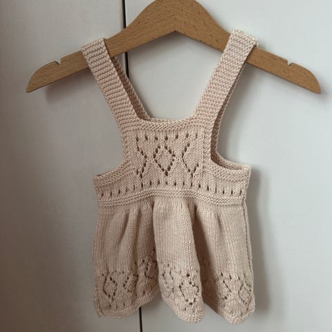 Hjemmestrikket kjole til pige i ca størrelse 68. Kjolen er meget lys lyserød / beige og har kortærmet, strikket design med strukturmønster på kroppen og glatstrikket bærestykke. Der er knaplukning ved skulderen, som gør det lettere at få blusen af og på. Jeg kender ikke garntypen.