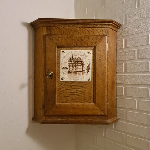 Ældre tobaksskab / væghængt skab i egetræ. Rigtig fin stand. Kommer fra rygerhjem, så trænger til en god gang rengøring.
