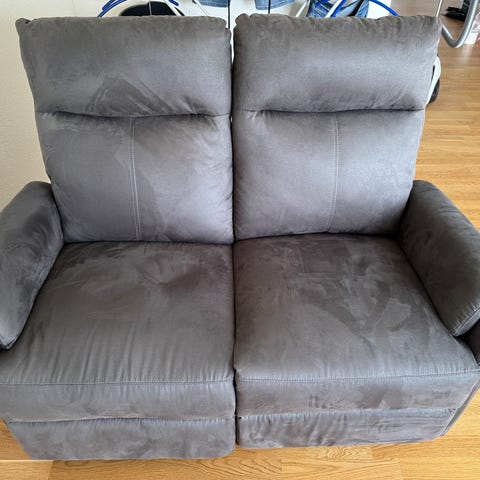 2-personers sofa med mørkegråt stofbetræk som ligner læder på afstand.
