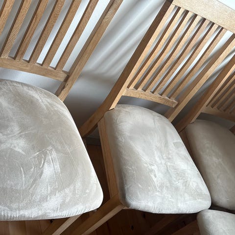 5 lyserøde stole med guld ben, fra Garant.