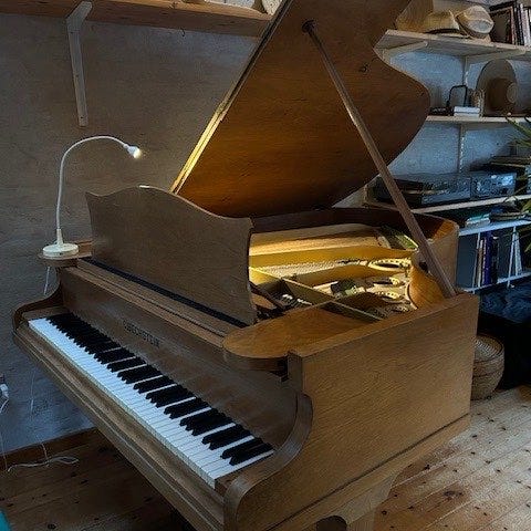 Emil Felumb flygel i sort finish. Instrumentet har fuld klaviatur med hvide og sorte tangenter samt åben klangbund med synlige strenge og mekanik. Egnet til brug i stue, øvelokale eller lignende musikrum, hvor der er behov for et akustisk flygel.