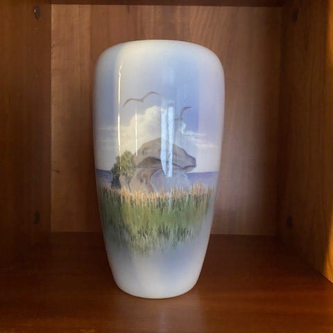 Bing & Grøndahl lågkrukke i porcelæn med håndmalet landskabsmotiv fra Møns Klint i blå og grå nuancer.