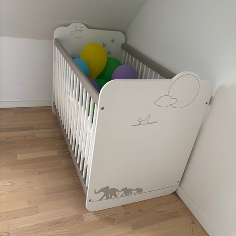 Solid og flot tremmeseng i træ sælges sammen med god madras og babydyne. Perfekt til baby eller mindre barn.