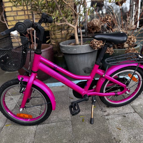 Børnecykel med 16" hjul i pink farve. Cyklen har støtteben, bagagebærer, kædeskærm og reflekser i hjulene. Egnet til mindre børn, der er klar til at cykle på en cykel uden støttehjul.