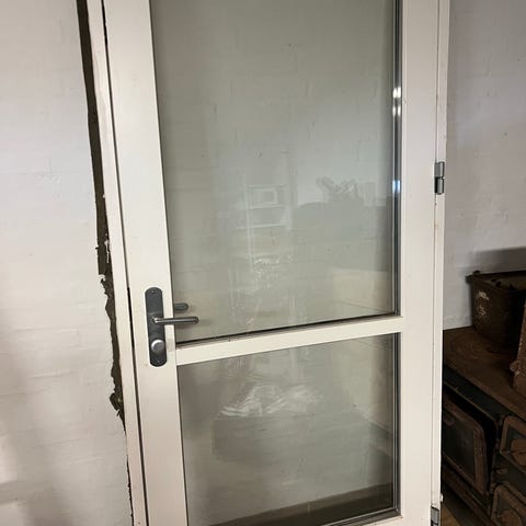 Hvid yderdør med glasfelter i den øverste del og fyldning i den nederste del. Døren har seks ruder i et klassisk vinduesparti. Velegnet som hoveddør eller bryggersdør, hvor der ønskes lysindfald gennem glasfelterne.