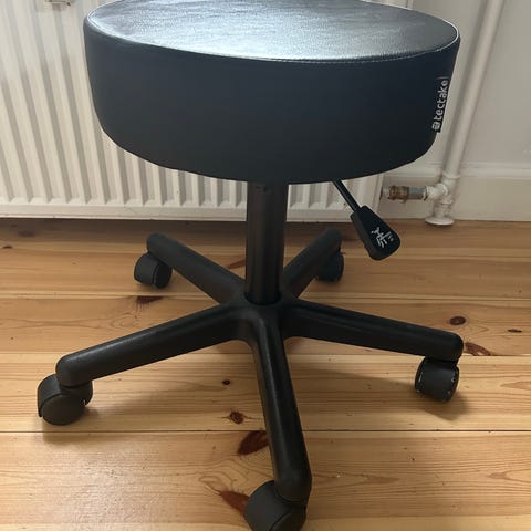 Taburet, 5 hjul, justerbar siddehøjde og separat justering af fodstøtte.