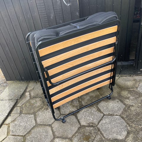 Jysk gæsteseng med madras og lamelbund. Sengen er sammenklappelig, hvilket gør den let at opbevare.