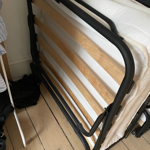 Madras med mørkt betræk og ramme i metal med trælameller. Velegnet som ekstra seng til gæsteværelse eller midlertidig soveplads.