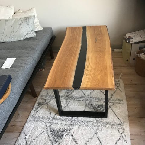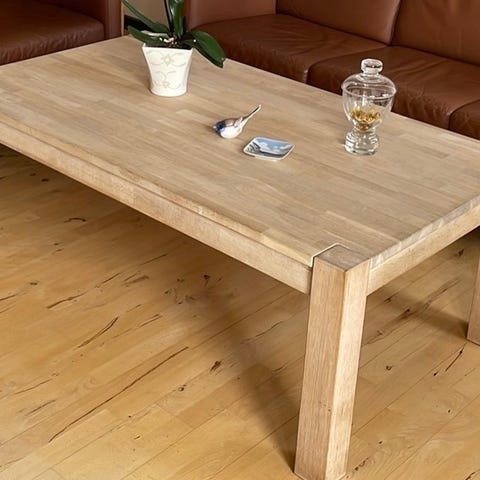 Sofabord i massiv eg sælges. Det er ikke IkEA, men kender ikke producenten. Kvaliteten er god, dog med brugsmærker, men det kan slibes let og friskes op. Bordet måler 110*80 uden plade, mens pladen måler 30 cm i tillæg.