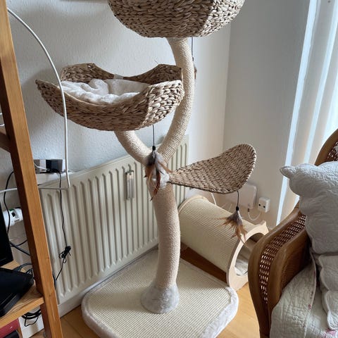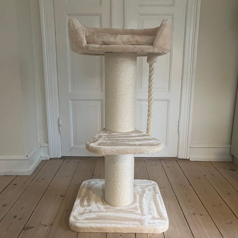 Klatretræ til kat i grå farve med flere niveauer og liggeplatforme. Modellen har to lukkede huler, flere åbne kurve og liggepladser samt to ramper. Stolperne er delvist beklædt med sisal til kradsning. Egnet til én eller flere katte til leg, hvile og klatring indendørs.