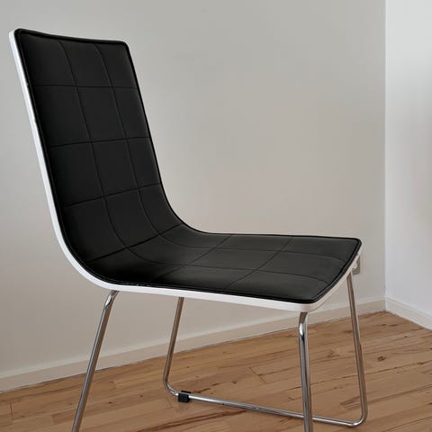 6 stk spisestuestole i sort kunstlæder med polstret sæde og ryglæn. Stolene har lige ryglæn med vandrette syninger og glatte flader. Ben i kromfarvet metal med firkantet profil. Egnet til brug ved spisebord eller mødebord. På billederne ses synlig slitage og afskalning i kunstlæderet på de to stole med mest afskalning. Der er en stol helt uden afskalning. Stolene fungerer fint og er behagelige at sidde på.