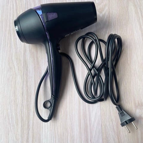 GHD føntørrer/hårtørrer i sort farve med aftagelig koncentrator. Enheden har flere varme- og hastighedsindstillinger, og ledningen er fastgjort til håndtaget. Produktet er designet til almindelig brug og leveres med en ekstra mundstykke til præcis luftstrøm.