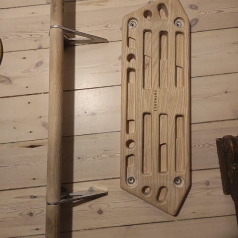 Beastmaker 1000 Series fingerboard i træ til klatretræning. Monteret på en træplade med to ekstra klatregreb i kunststen i hver side. Boardet har flere forskellige dybder og grebstyper til finger- og grebsstyrketræning. Egnet til montering over dørkarm eller på væg til indendørs træning.