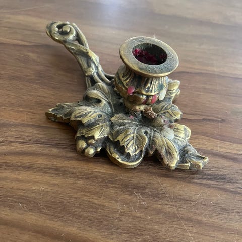 Lysestage i spiralformet messing. Højden er ca. 28 cm, og foden måler ca. 12 cm i diameter. Øverste åbning er rund og beregnet til et almindeligt stearinlys. Velegnet som enkeltstående lysestage eller som del af en lysestagesamling til bord- eller vinduesdekoration.