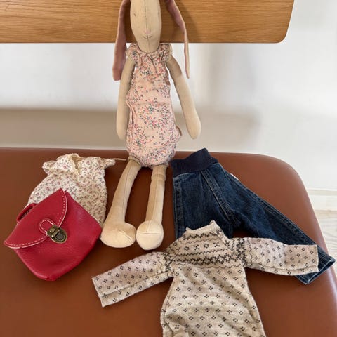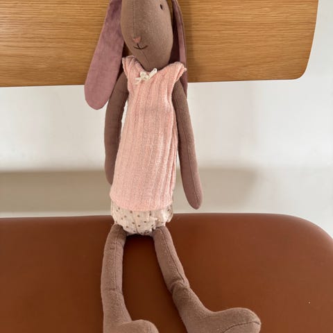 Maileg kanin bamse i stof med lange ører og broderet ansigt. Kaninen er klædt i lyserød blomstret stofkjole. Bamsen er blød og beregnet som legetøj eller pynt på børneværelset. Velegnet til leg, kram og som del af en samling af Maileg figurer.