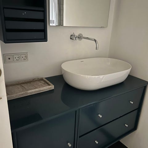 Montana med skuffer og låge. Brugt og på øverst på fladen bageste (bag ved den hvide lampe) har der været fugt efter en vase, så der er en plamage - se billede