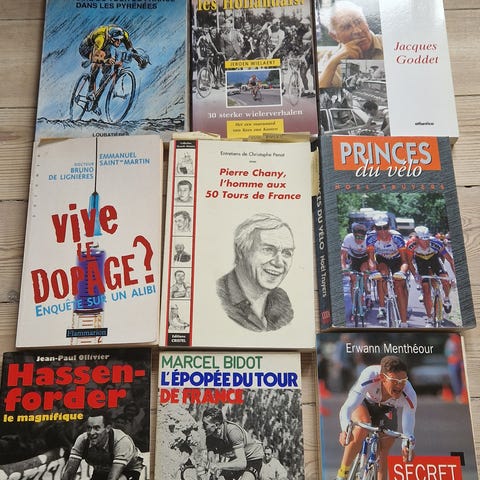 Er man cykel fanatiker, har vi en kæmpe samling af cykelbbøger, som vi har arvet af journalist som samlede, og selv skrev. Disse er på engelsk, har også på dansk og fransk.