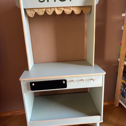 Flexa legebutik til børn i træ med grøn overflade. Butikken har skilt med teksten "SHOP" øverst, lille markise i stof samt hylder og åbent rum til opbevaring af legemad eller tilbehør. Velegnet som rollelegsmøbel på børneværelset eller i legeområder.