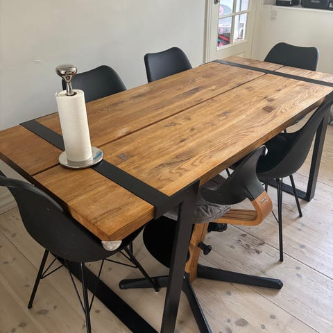 Super lækkert olieret plankebord i massivegetræ. Dansk design med flotte detaljer. Kan evt. skilles ad i forbindelse med transport da det er meget tungt. Sælges alt for billigt pga. flytning.