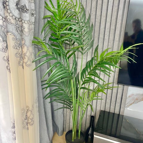 Stueplante palme i potte. Planten har lange, slanke blade og er ca 100cm høj; med potte er ca 140cm