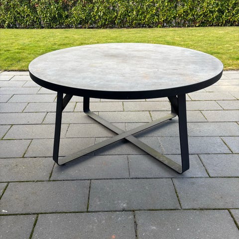 Rundt havebord, perfekt til lounge, i betonlook med grå bordplade og sort metalstel. Bordet måler ca. 42 cm i højden og har en diameter på ca. 90 cm. Stellet er udført i krydsformede ben, der giver stabilitet. Velegnet som sofabord eller loungebord på terrasse eller altan.