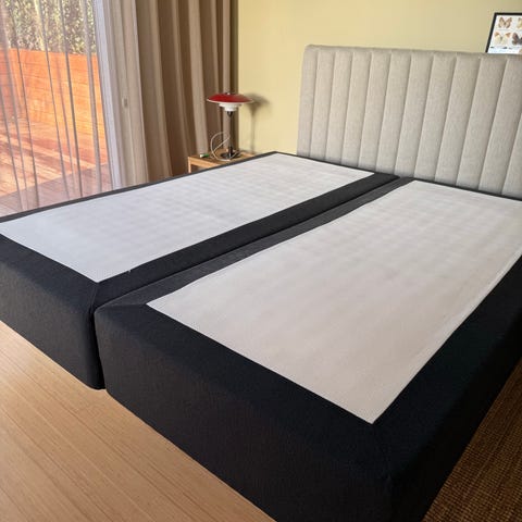 Sengen består af 2 enkeltsager på 90x200 og en topmadras på 180x200, Sengen er meget pæn og har været beskyttet af vandtæt lagen under brug. Den har dog en plet Som jeg har forsøgt at tage et billede af men man ser den ikke så godt på billedet.