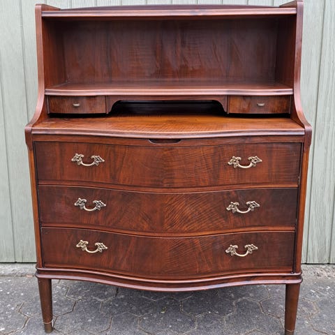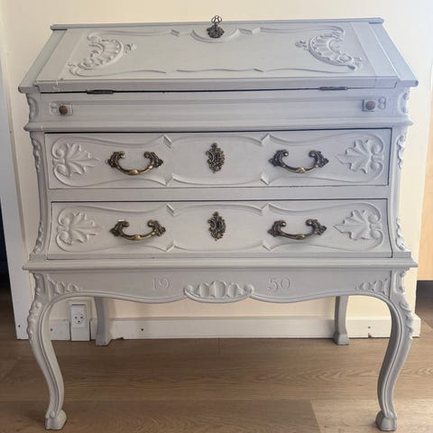 Det har et rigtig fint klassisk udtryk med skrå klap, mange små skuffer og et praktisk skriveområde indeni. Et dekorativt og charmerende møbel, som både kan bruges til opbevaring og som arbejdsplads.