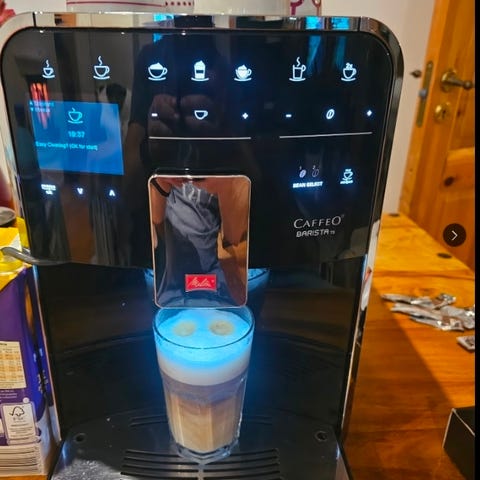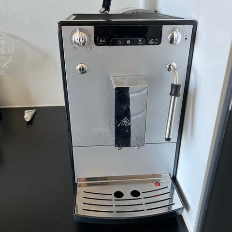 Melitta fuldautomatisk espressomaskine i sort. Maskinen er beregnet til hele kaffebønner og brygger espresso og andre kaffedrikke automatisk. Fronten har touchknapper og central udløbstud med højdejustering til kopper og glas. Drypbakken kan tages af for rengøring. På billederne ses en revne i nederste del af fronten. Medfølgende tilbehør omfatter vandfilter til fuldautomatiske kaffemaskiner samt Melitta Perfect Clean rensevæske til espressomaskiner. Maskinen tilsluttes almindelig stikkontakt og er egnet til brug i køkken eller tekøkken, hvor der ønskes automatisk kaffebrygning fra bønner.