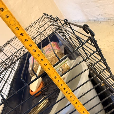 Der er lidt brugsspor og buret mangler de clips der holder tremmerne på plads i enderne. Vi har brugt det uden, hvilket har fungeret fint, men kan se de kan købes billigt i web dyrebutikker .