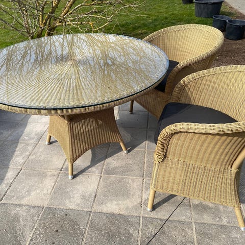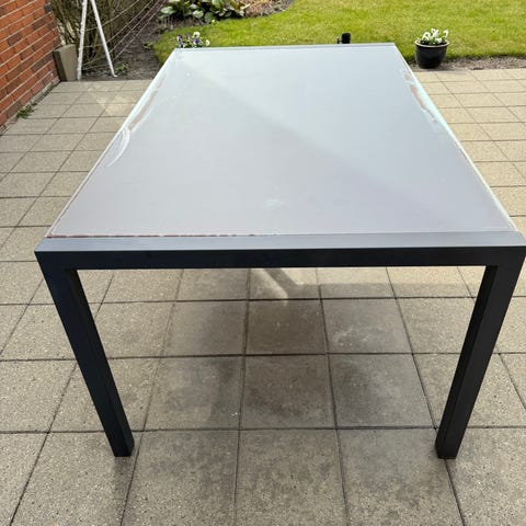 Kvadratisk havebord med sort fletstel og glasplade. Bordet har afrundede hjørner og en lav profil, som egner sig til brug på terrasse eller altan. Glaspladen giver en glat og hård overflade, der er let at tørre af, og stellet i flet er velegnet til udendørs brug. Bordet kan anvendes som sofabord eller loungebord i havemiljøer.