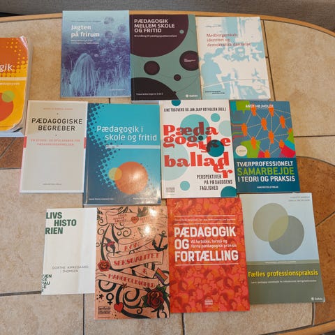 Samling af fagbøger vedrørende pædagog uddannelsen med gule overmarkeringer hist og her. Under bøgerne på foto er der 20 bøger med relevante emner.