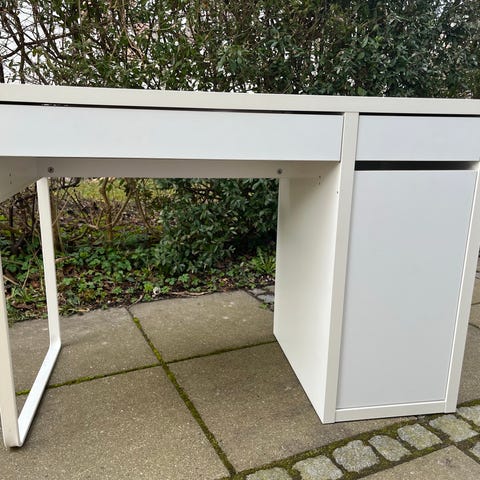 En skrivepult med skuffe, skylde og opbevaringsrum.