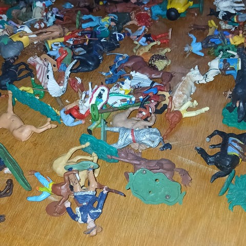 Britains Deetail western figurer samling plastikfigurer i farverigt design. Sættet består af flere cowboys, indianere og heste på grønne baser. Figurerne er støbt i plastik med malede detaljer og er mærket "Britains Ltd" og "Deetail" på undersiden, fremstillet i England. Egnet til samling, udstilling eller legemiljøer med western-tema.