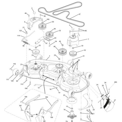 Mower deck 48" klippebord til havetraktor. Klippebordet er beregnet til montering under en havetraktor og har en klippebredde på 48". Det er udført i metal med flere remskiver og ruller til drivrem, samt sideudkast med plastskjold mærket 48. Medfølgende sprængskitse viser opbygning med lejer, remskiver, knive og beslag, hvilket kan bruges til montering og reservedele. Velegnet som erstatningsklippebord til kompatible havetraktorer med tilsvarende ophæng og remføring.