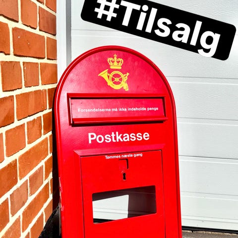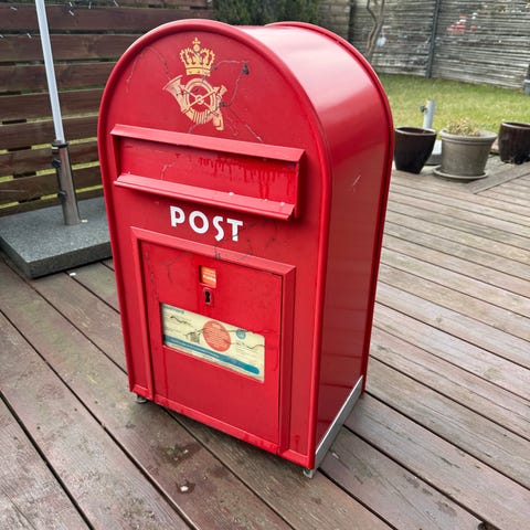 Post Danmark ovalt postskilt i rødmalet metal med gul tekst "POST" og posthornmotiv med krone. Skiltet har huller langs kanten til ophæng og er ensfarvet rødt på bagsiden. Velegnet som dekoration eller samlerobjekt relateret til dansk posthistorie.