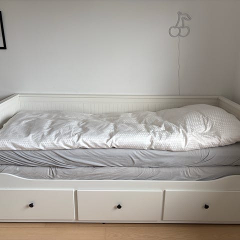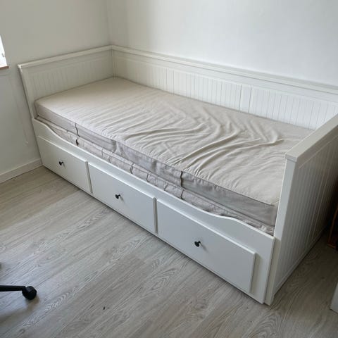 IKEA seng i hvid med udtræksseng og integrerede skuffer. Sengen fungerer som enkeltseng og kan trækkes ud til dobbeltseng. Under sengen er der tre skuffer til opbevaring. Ryg- og gavlpaneler har lodrette fyldninger. Der ses brugsspor på kanten af sengekanten, som vist på billedet. Velegnet til brug i gæsteværelse, børneværelse eller som kombineret sofa- og soveplads. Model HEMNES sælges incl. begge madrasser - latex og skum. Ps sorte bøjler på væggen bag sengen på billederne er ikke en del af sengen.