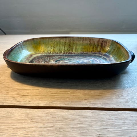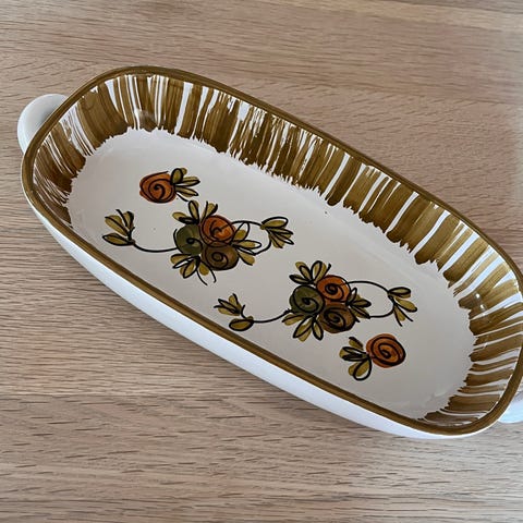 Bangholm ovnfast fad i rektangulær form. Fadet er i keramik/stenware med dekoration af flerfarvet blomstermønster. Mål 22x10cm h 6,5cm