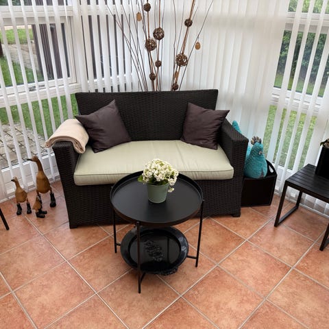 Havemøbelsæt bestående af en mindre sofa og 4 stabelbare stole i sort fletlook. Sættet er egnet til udendørs brug i have, på terrasse eller altan. Materialet er et plastbaseret fletlook, som er beregnet til at kunne stå ude. Sofaen har armlæn og plads til to personer. Stolene kan stables for nem opbevaring, når de ikke er i brug. Sættet placeres på fast underlag i haven eller på terrassen.