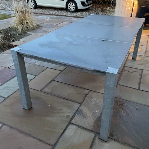 Havebord med granitbordplade i grå nuance. Rektangulært bord egnet til udendørs brug på terrasse eller i have. Bordpladen fremstår som massiv sten/granit med metalindlæg, og stellet er i metal. Velegnet som spisebord til flere personer i haven eller på altan/terrasse. Stole på billederne indgår kun, hvis det er angivet særskilt i annoncen.