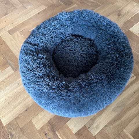 Oval kæledyrsseng i grå og hvid. Indersiden er foret med blødt, hvidt plys, og ydersiden er i gråt stof med stribet struktur. Sengen har polstrede kanter hele vejen rundt, som giver støtte og en afgrænset liggeplads. Velegnet til mindre hunde eller katte som hvile- og soveplads i hjemmet.