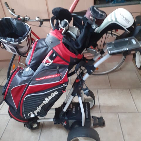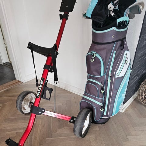 MacGregor CG-4000 golfsæt med standbag i sort, hvid og gul. Sættet omfatter golfbag med benstativ og flere rum til opdeling af køller. I bagen ses forskellige jern samt headcovers til køller markeret CG-4000. Der medfølger desuden en pose golfbolde, tees og en golfhandske i emballage. Velegnet som komplet golfsæt til spil på bane eller træning på driving range.