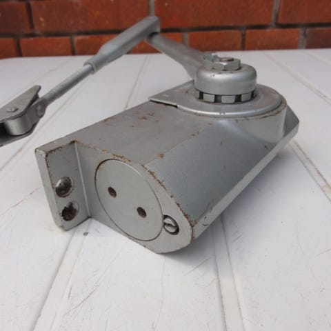 Dorma dørpumpe i sølvfarvet metal. Mekanisk dørpumpe til montering på dør og karm, med justerbar arm. Egnet til indvendige eller udvendige døre, hvor der ønskes kontrolleret lukning af døren.