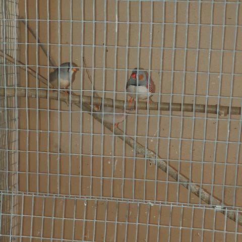 Zebrafinke fugl i bur. Fuglen har grå og hvide fjer samt orange næb og ben. Egnet som selskabsfugl i voliere eller indendørs fuglebur