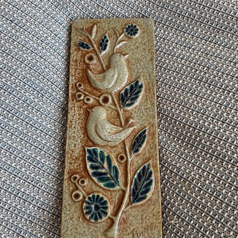 Keramisk vægplatte med reliefmotiv af hane i flere farver. Platten er kvadratisk med let hævede kanter og dekoreret på forsiden, mens bagsiden har ophængssnor. Måler 12 x 13 cm.