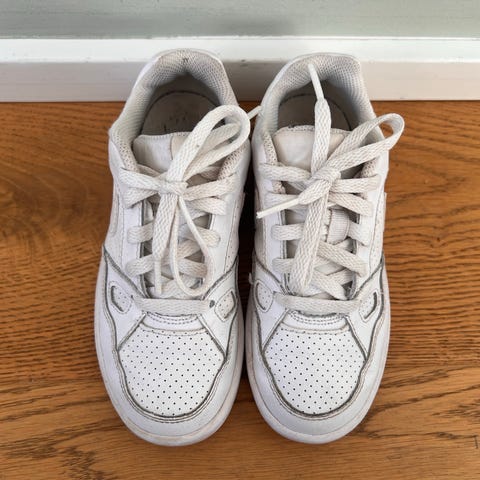 Skoene er hvide med klassisk Nike Swoosh-logo på siderne og AIR-logo på hælen. Overdel i glat materiale med perforeringer ved tæerne for ventilation. Lav skaft-højde og snørelukning. Velegnet som hverdagssko eller fritidssko til både piger og drenge.