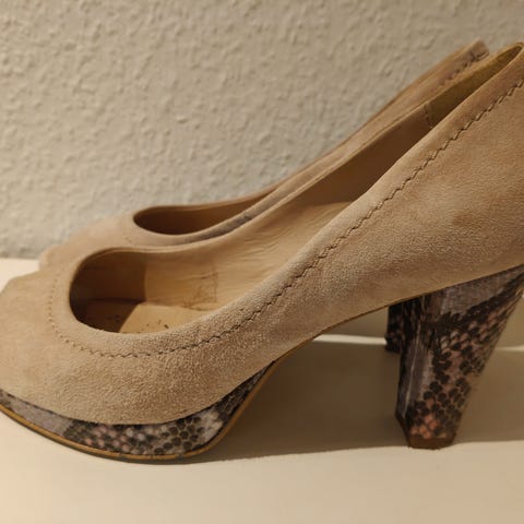 Hælen er middelhøj, ca. 5 cm, med trælook. Indersålen er polstret.